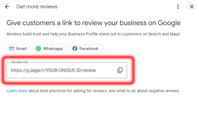 - Locate the “Share review form” button and click on it. This will generate a unique URL that directs users to leave a review for your business.